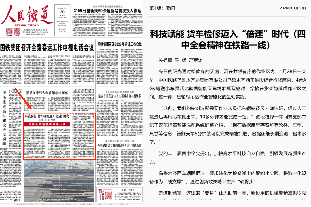 冬日的阳光透过检修库的天窗,洒在井然有序的作业区内。1月28日一大早,中国铁路乌鲁木齐局集团有限公司乌鲁木齐西车辆段综合检修库内,4台AGV输送小车灵活地驮着智能天车精准抓取轮对,穿梭在货架与落成作业区之间。这一幕,是轮对吊运作业智能化的生动实践。“以前,我们的轮对选配需要作业人员把车辆轮径尺寸确认好,经过人工挑选后再用吊车抓出来,10多分钟才能完成一组。”该段检修一车间党支部书记王汉东指着智能选配系统屏幕介绍,“现在数据库里存着所有轮径、车型、尺寸等信息,智能天车5分钟就可以完成精准抓取,数据还能长期追溯,省事多了。”