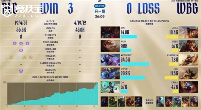 第三局BLG延续强势对线表现,下路再次打出线杀,中路依旧保持压制。Jiejie猴子被算计后节奏全无,试图支援下路也无力回天。Viper伊泽瑞尔火力全开,12分钟便对位领先Elk希维尔超过3K经济,WBG下路比上一局崩得更快。中期BLG稳健运营控下土龙魂,并在优势局面下轻松收下大龙。打龙同时Bin塞恩开车留人,配合knight辛德拉精准推人瞬间融化Jiejie猴子。BLG逐个击破,顺势一波结束比赛,完成横扫。